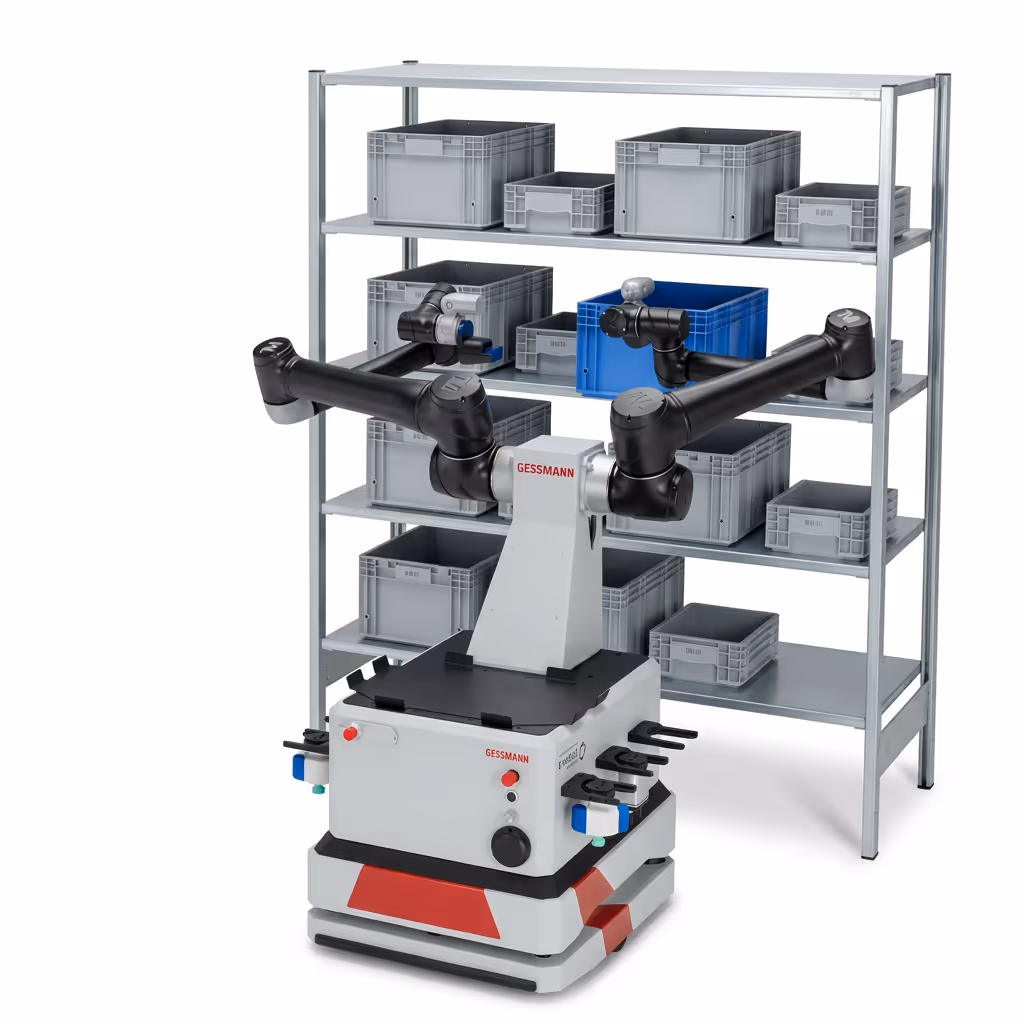 Together with Gessmann, we developed a dual-arm AGV that doesn't just move through your facility but acts within it. Powered by EvaLib, both arms plan and execute motion autonomously in real-time, no training data, no lengthy setup, no black box. Gessmann's proven GESSbot platform delivers the hardware foundation, we deliver the intelligence that makes it move. The result is a single system that picks, places, sorts and handles, flexible enough to cover logistics, assembly, bin picking and more.