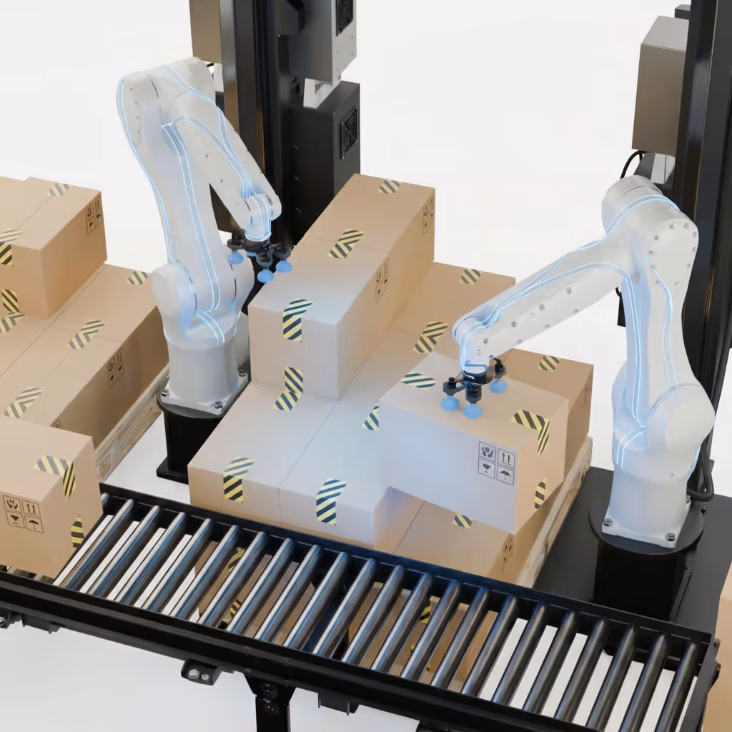 Palletizing at scale means multiple robots sharing the same space, handling different products at the same time. Without smart coordination, that creates conflicts, idle time, and costly collisions. EvaLib keeps every robot moving in sync, optimizing paths in real time so they work in parallel without getting in each other's way. New product formats integrate without rebuilding the whole setup, giving you faster cycle times and a system that grows with your operation.